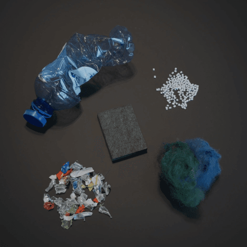 Unser PET-Filz besteht zu mindestens 60% aus recycelten PET-Flaschen. Die Flaschen werden zu Fasern verarbeitet, die in einem Mischraum mit Fasern in verschiedenen Farben vermischt werden. So entsteht ein neuer Ton mit einem melierten Effekt: Kleine Faserreste der gemischten Farben bleiben sichtbar und verleihen dem Filz sein einzigartiges Aussehen.