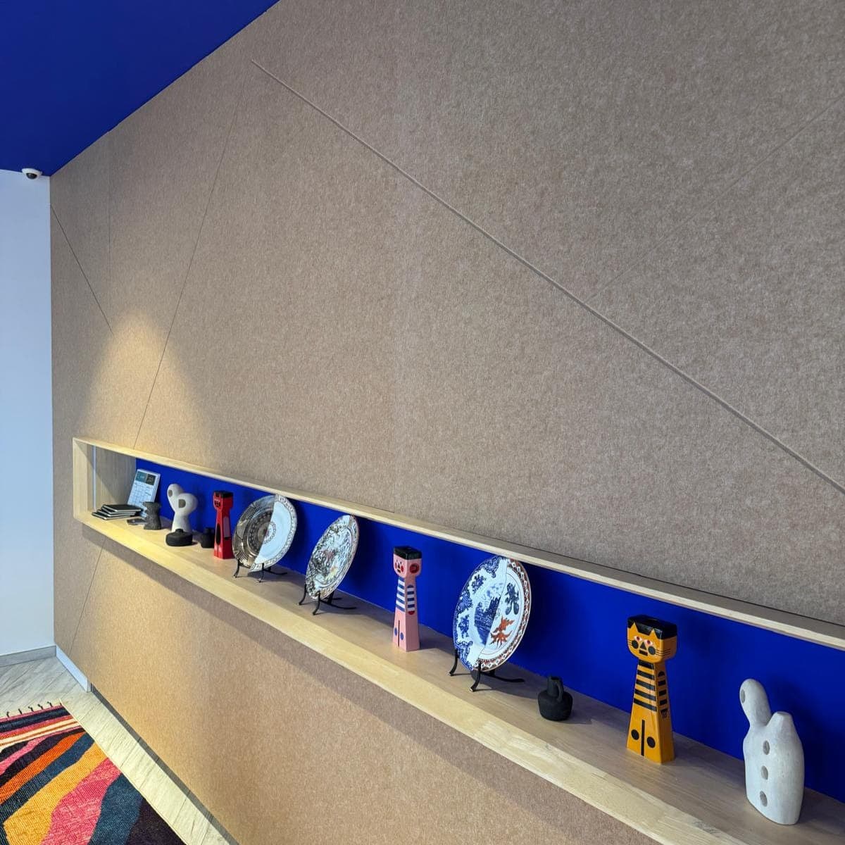 Filz-Wandbekleidung ist eine ausgezeichnete Wahl für diejenigen, die nach einer nachhaltigen Alternative zu Farbe oder Tapete suchen. Interesse? Fragen Sie nach Proben und sehen Sie, welche Farbe für Ihr Design geeignet ist!