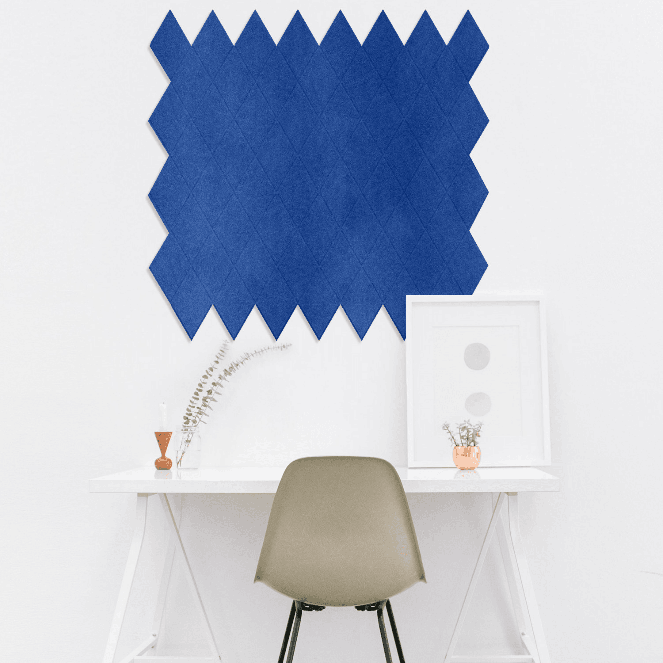 Der EASYfelt Stick Diamond besteht aus stilvollen PET-Filzfliesen in Rautenform. Es ist ein selbstklebendes akustisches Wandelement, das Schall absorbiert und Ihrem Raum eine ansprechende Optik verleiht. Obwohl es den Schall dämpft, ist es vor allem für die Reduzierung leichter Nachhallgeräusche geeignet. Dank der selbstklebenden Rückseite lassen sich die Paneele einfach und ohne zusätzliches Werkzeug anbringen.